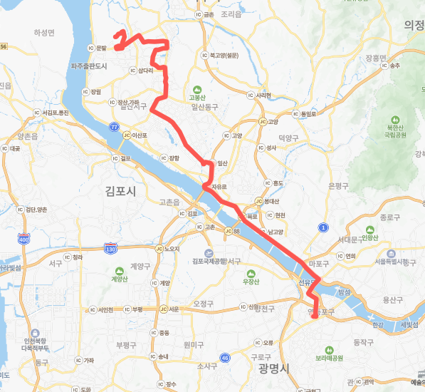 파주 연다산동 차고지 - 운정신도시 - 탄현역 - 대화역 - 주엽역 - 정발산역 - 마두역 - 백석역 - 당산역 - 영등포시장 - CM 충무병원